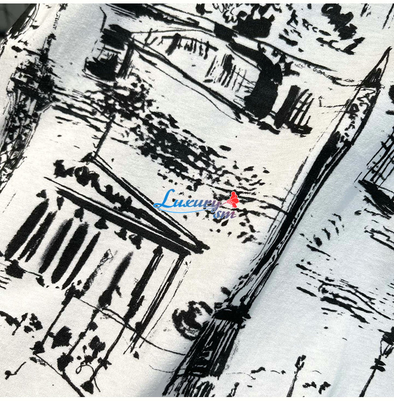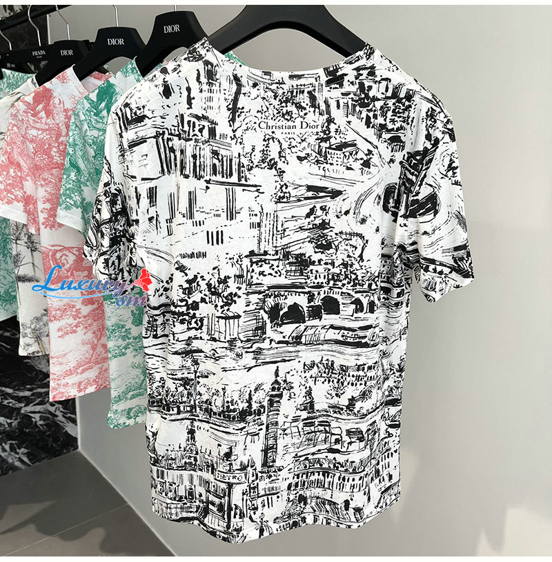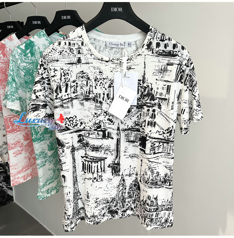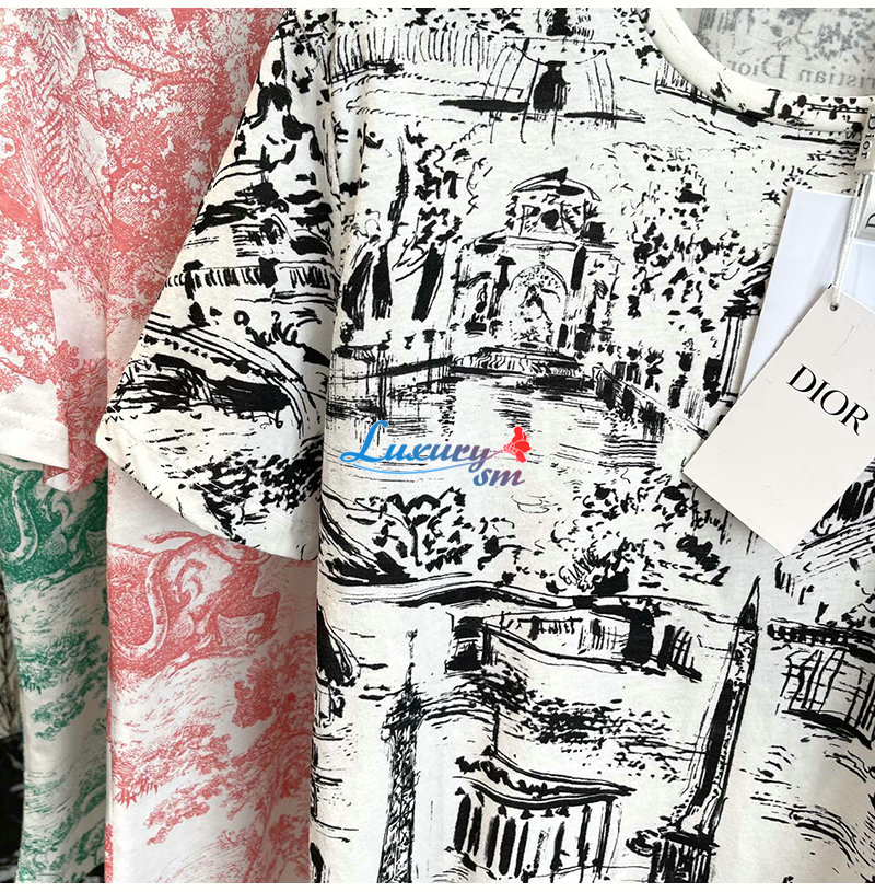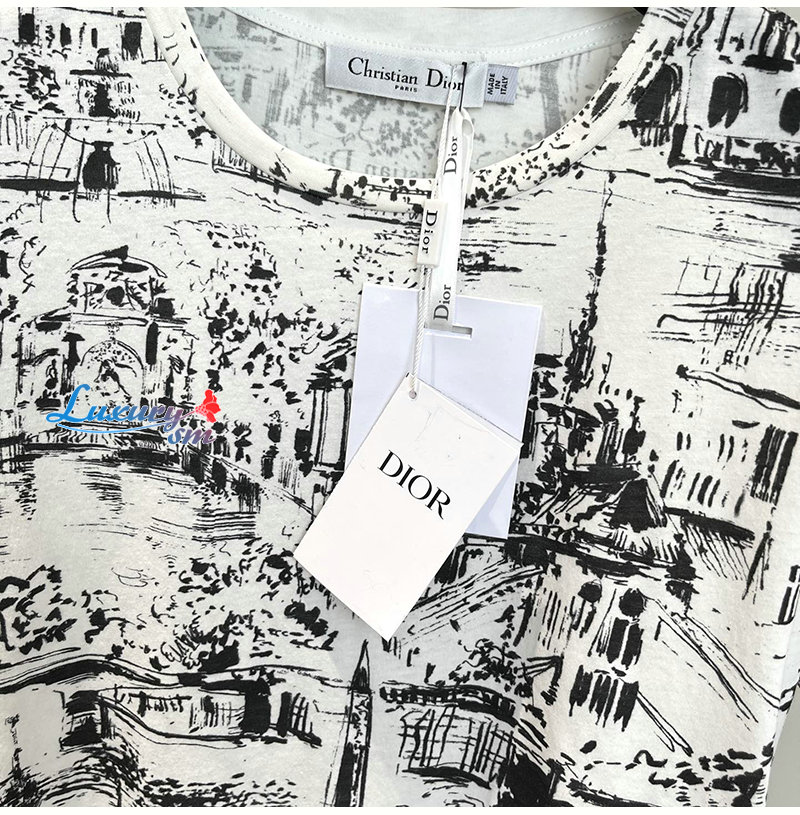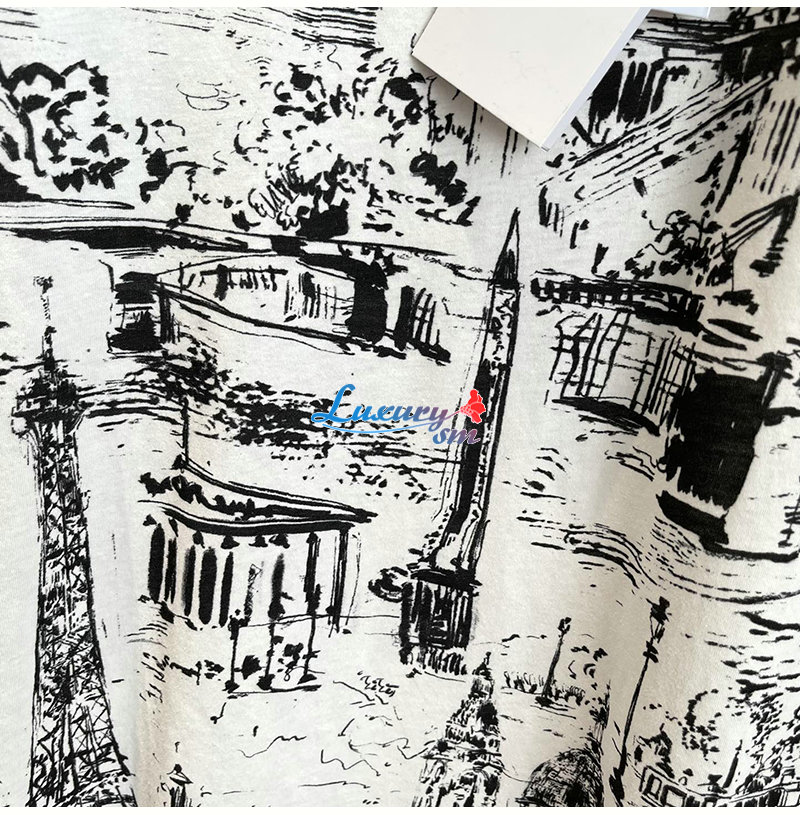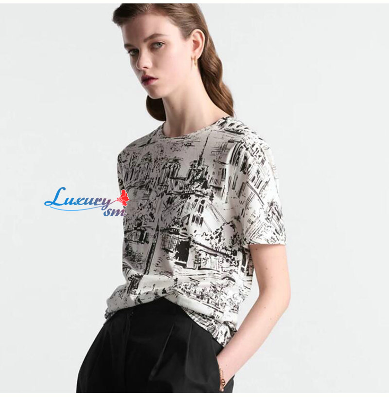DIOR-443T09 디올 화이트/블랙 Paris Allover 모티브 티셔츠 여성용
