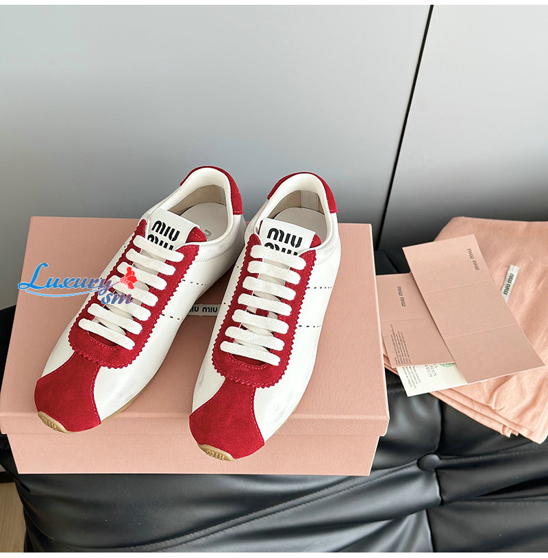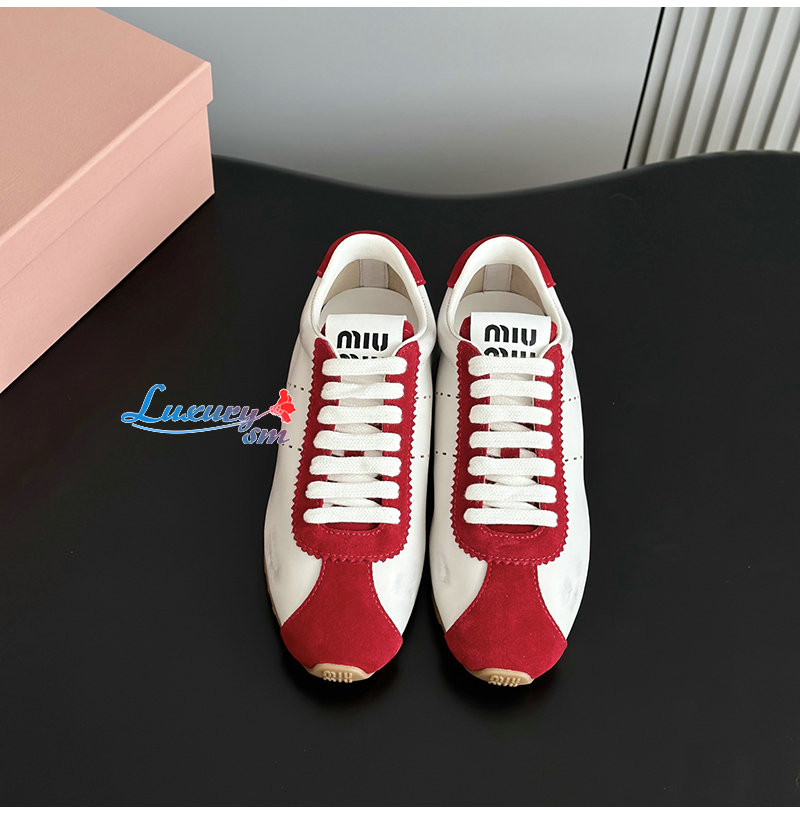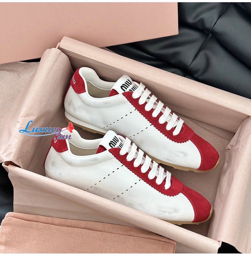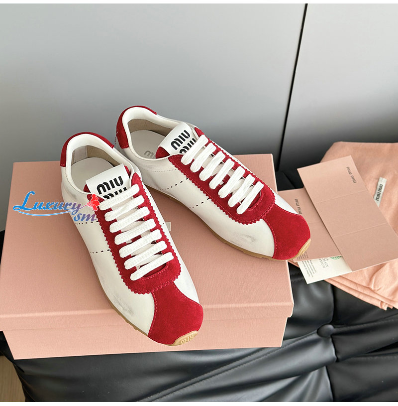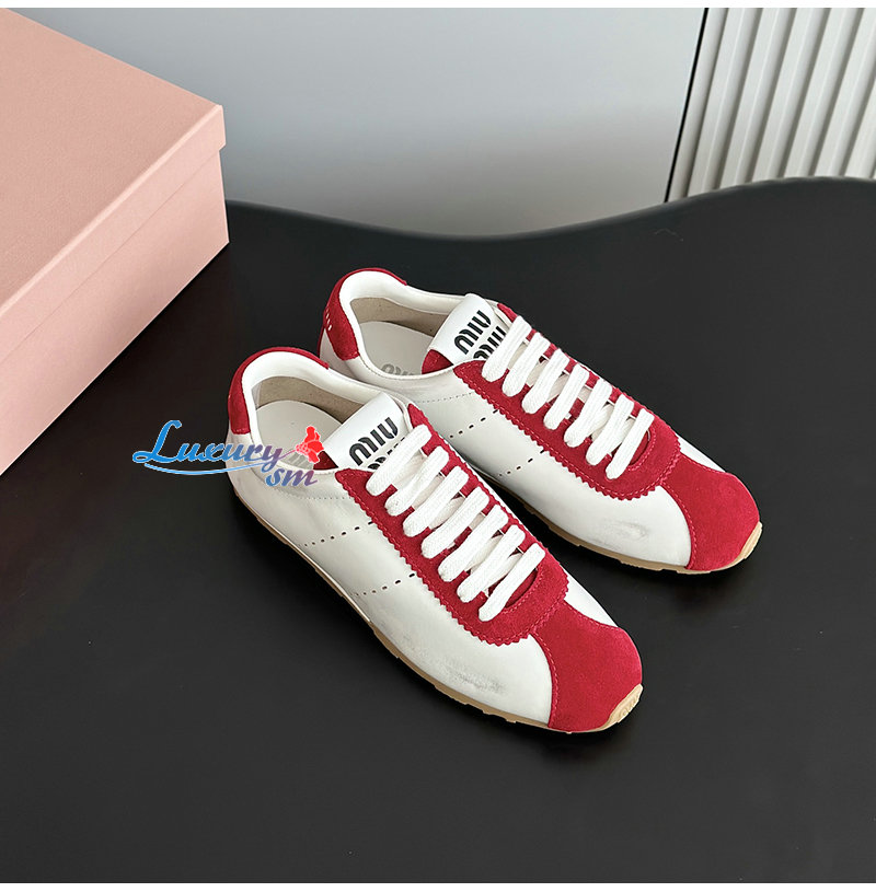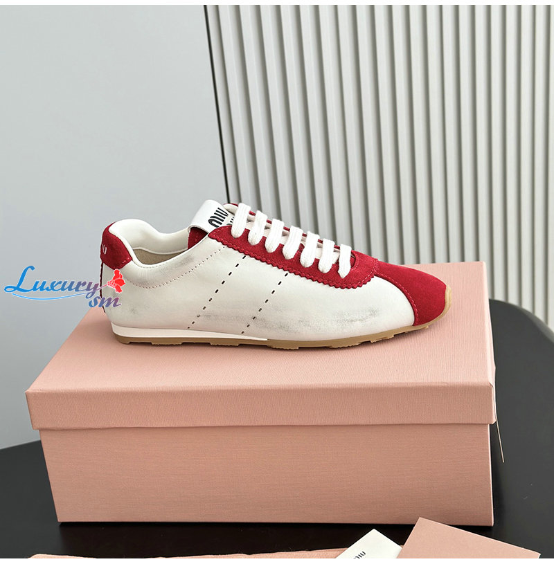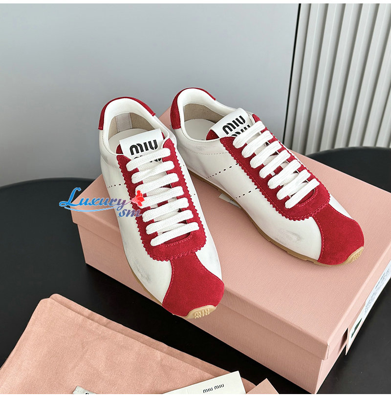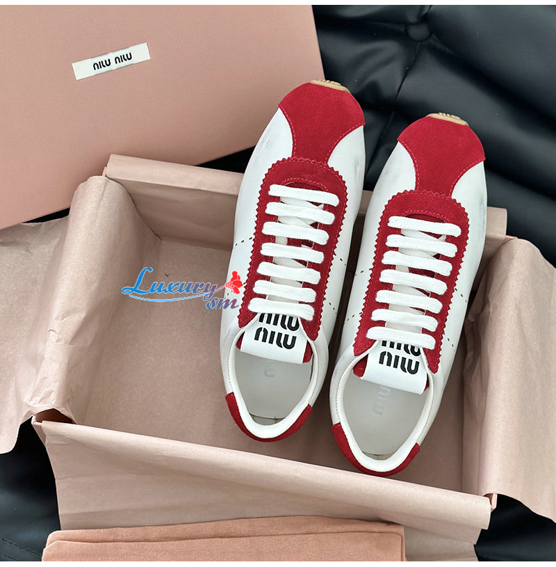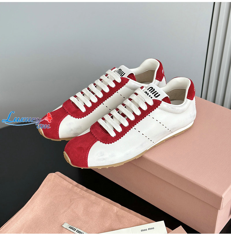 MIUMIU-5E114E 미우미우 화이트/레드 플룸 나파 가죽 스웨이드 스니커즈 여성용