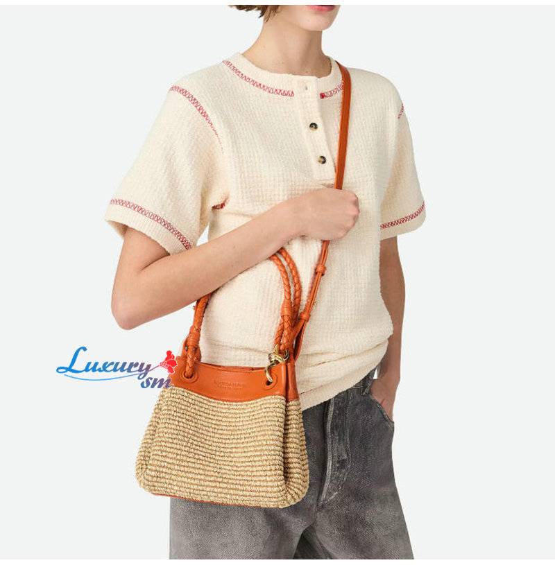 을 갖춘 라피아 토르숑 및 가죽 소재의 숄더 백.